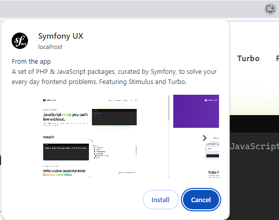 Progressive Web App screenshots enable richer installation UI. As shown below, by default only the application name and short name are visible.
