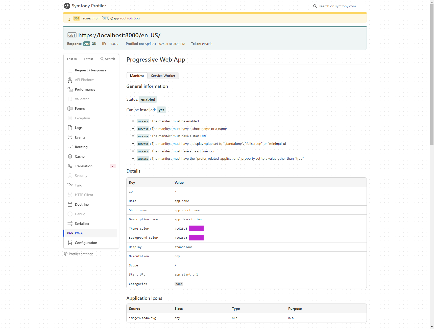 The Manifest options, the Service Worker rules, the icons and other interesting information are showed on the tool pages.